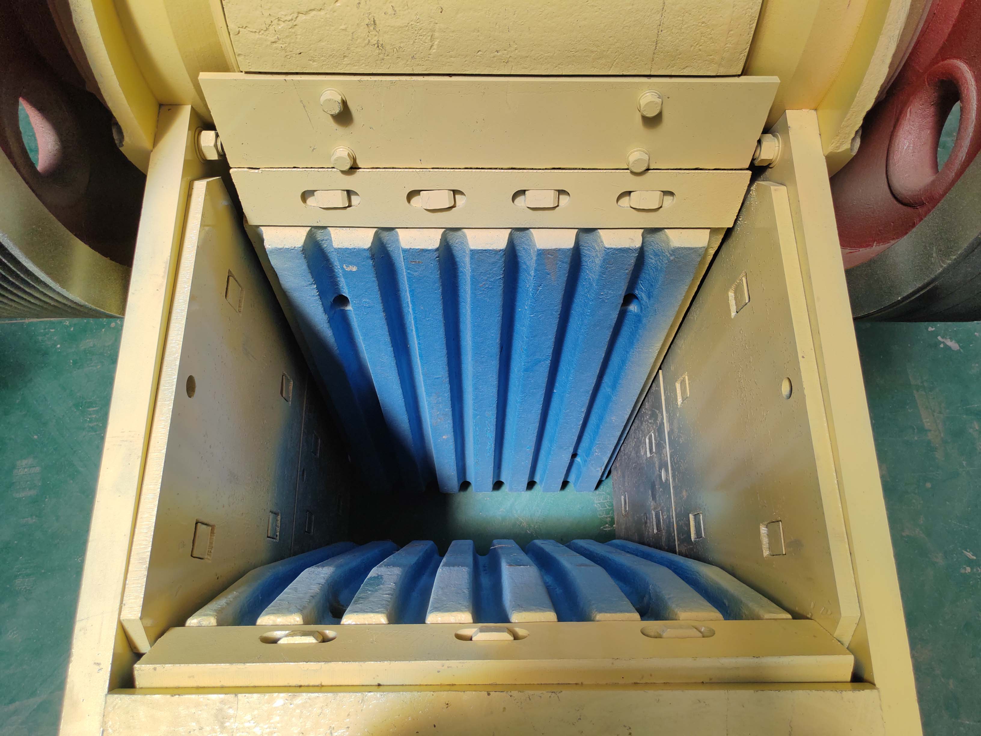 整体结构确保设备与机架更为贴合,避免了在紧固过程中对轴承造成的不必要径向载荷,使轴承运行更为平稳;液压调节排料口更简单、方便,减少了停机次数。电机座与设备机架采取一体式安装方式,不仅节约了颚式破碎机的安装空间,减少了三角带的长度,使电机与设备同步运动,延长了设备的使用时间。